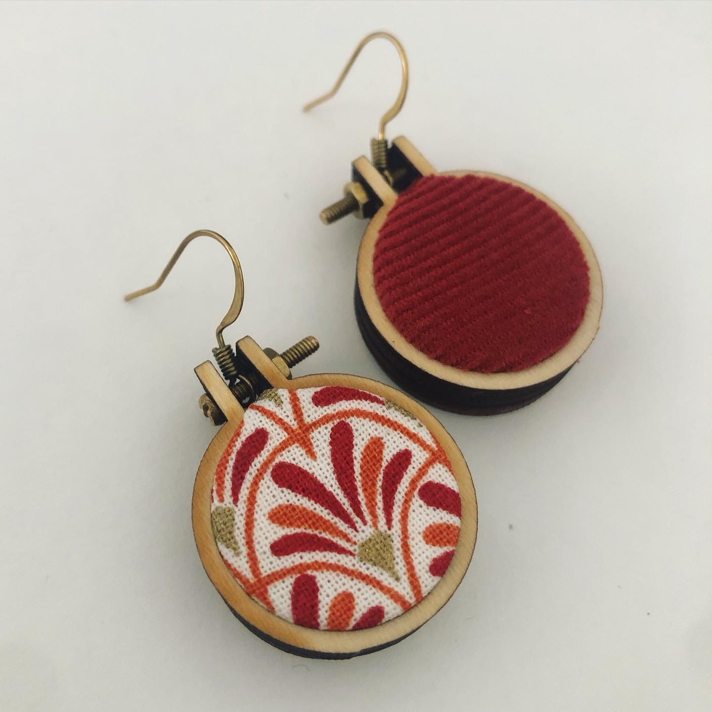 Création unique et dépareillée faite à partir de chutes de tissus et de tambours à broder version « mini ».