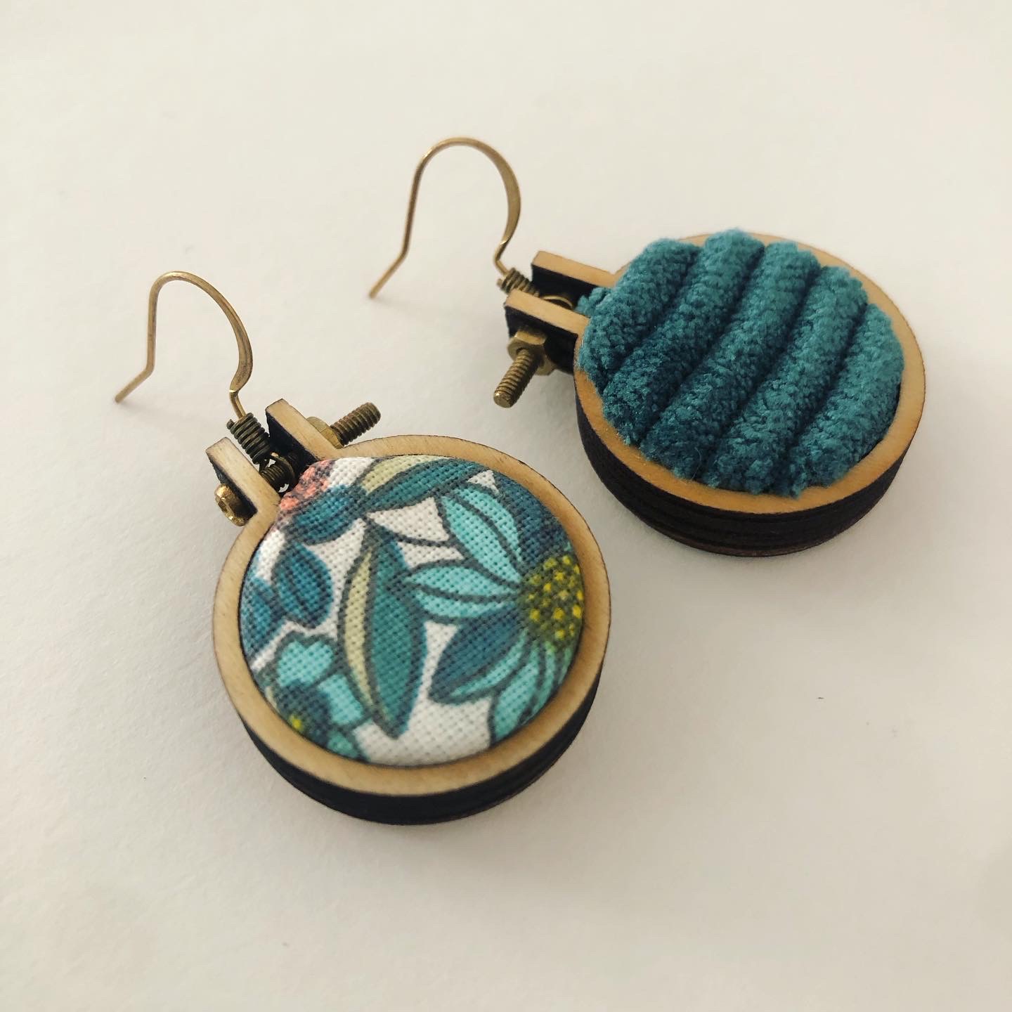 Création unique et dépareillée faite à partir de chutes de tissus et de tambours à broder version « mini ».